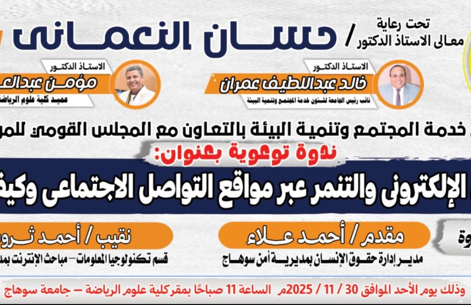 قطاع خدمة المجتمع وتنمية البيئة بالكلية ينظم ندوة توعوية حول “أشكال التحرش الإلكتروني والتنمر عبر مواقع التواصل الاجتماعي وكيفية التعامل معها” تحت رعاية أ.د/ حسان النعماني رئيس الجامعة أ.د/ خالد عبداللطيف عمران نائب رئيس الجامعة لشئون خدمة المجتمع وتنمية البيئة أ.د/ سحر وهبي رئيس المجلس… اقرأ المزيد »قطاع خدمة المجتمع وتنمية البيئة بالكلية ينظم ندوة توعوية حول “أشكال التحرش الإلكتروني والتنمر عبر مواقع التواصل الاجتماعي وكيفية التعامل معها”