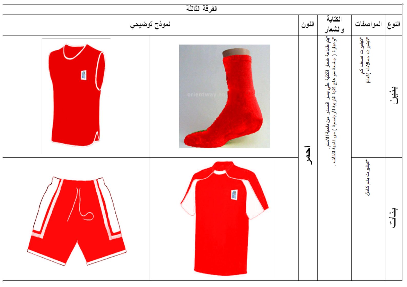 الفرقة الاولي النوع المواصفات الكتابة والشعار اللون بنين *تيشيرت نصف كم *تيشيرت حمالات (كت) * يتم طباعة شعار الكلية علي يسار الصدر من ناحية الامام . * وعبارة ( جامعة سوهاج كلية التربية الرياضية ) من ناحية الخلف . اصفر بنات *تيشيرت… اقرأ المزيد »ملابس الفرقة الاولي لعام 2016