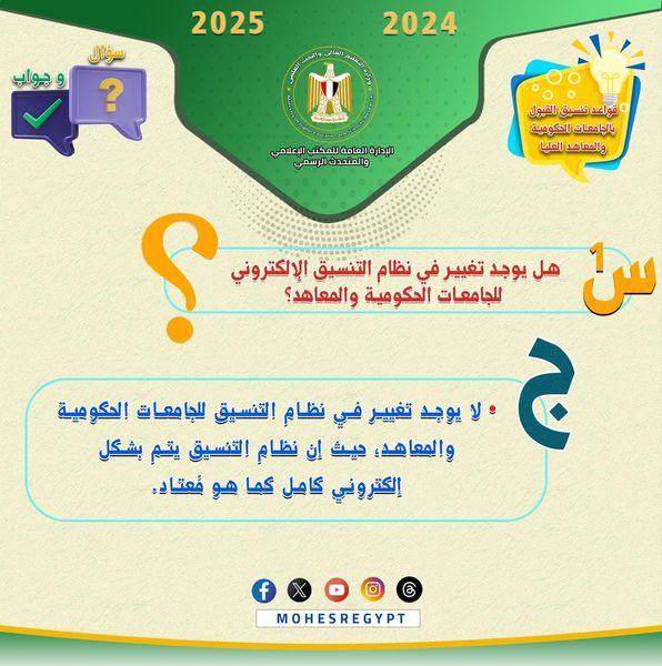 استعدادًا لتنسيق الجامعات الحكومية والمعاهد التعليم العالي تنشر انفوجرافات حول تنسيق القبول بالجامعات الحكومية والمعاهد لطلاب الثانوية العامة في “سؤال وجواب”