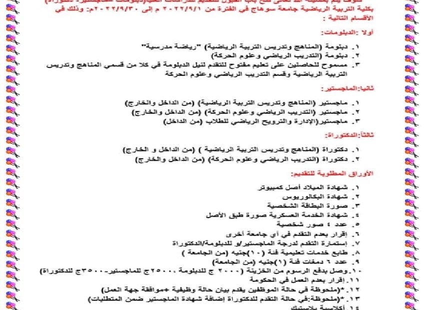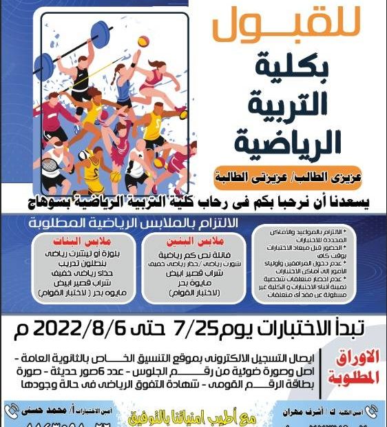بدء التسجيل لأداء اختبارات القدرات للقبول بكلية التربية الرياضية بسوهاج
