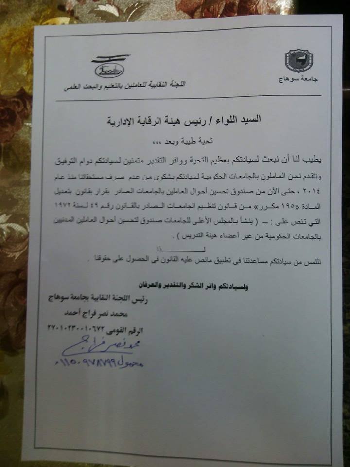 بلاغ مقدم من نقابة العاملين بجامعة سوهاج للرقابة الادارية . بشأن عدم صرف مستحقات العاملين بالجامعات من صندوق تحسين دخولهم حتى الآن .