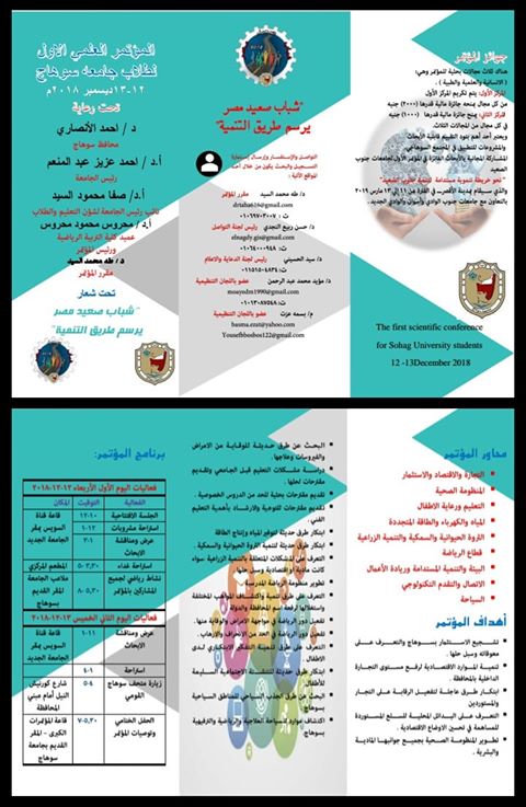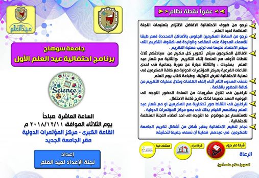 برنامج احتفالية عيد العلم الأول بجامعة سوهج غدا الثلاثاء الموافق 11 ديسمبر 2018م، بمركز المؤتمرات بالجامعة الجديدة