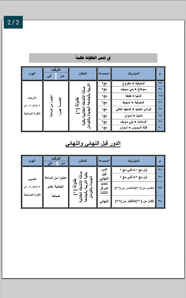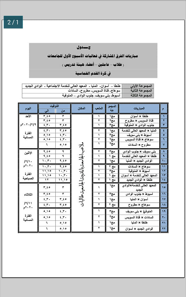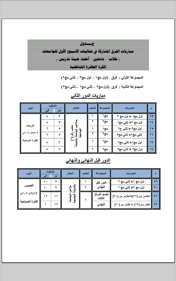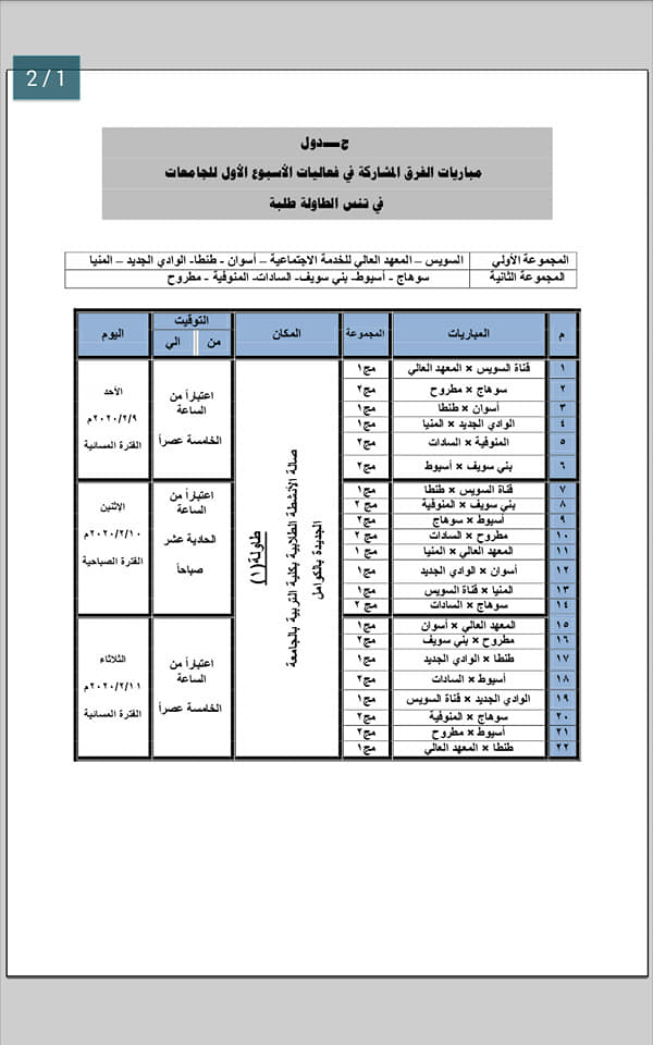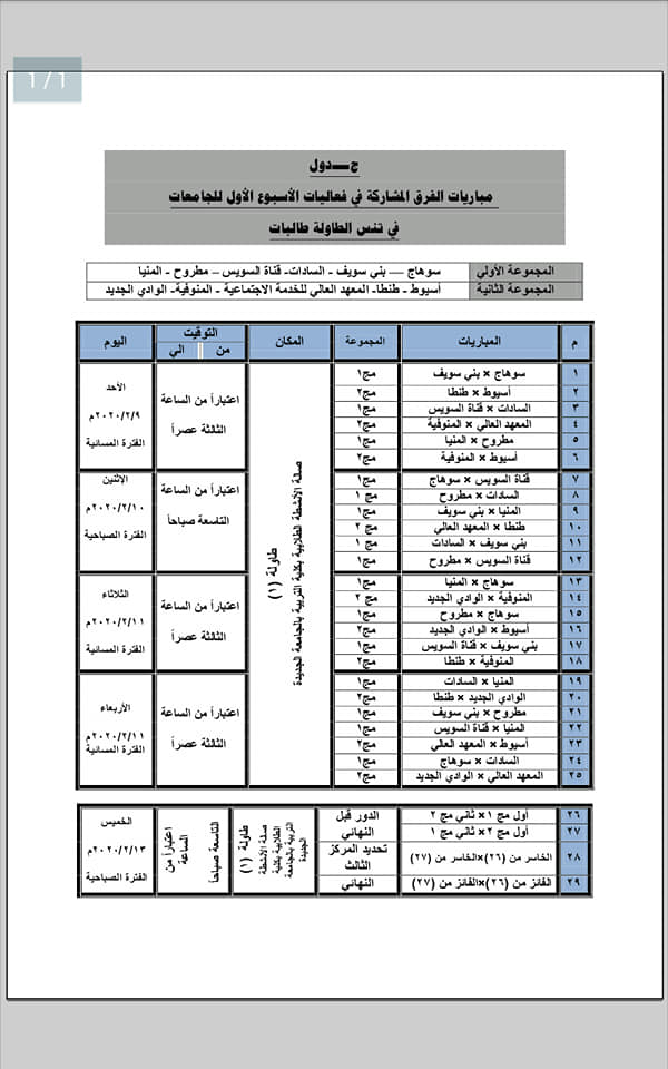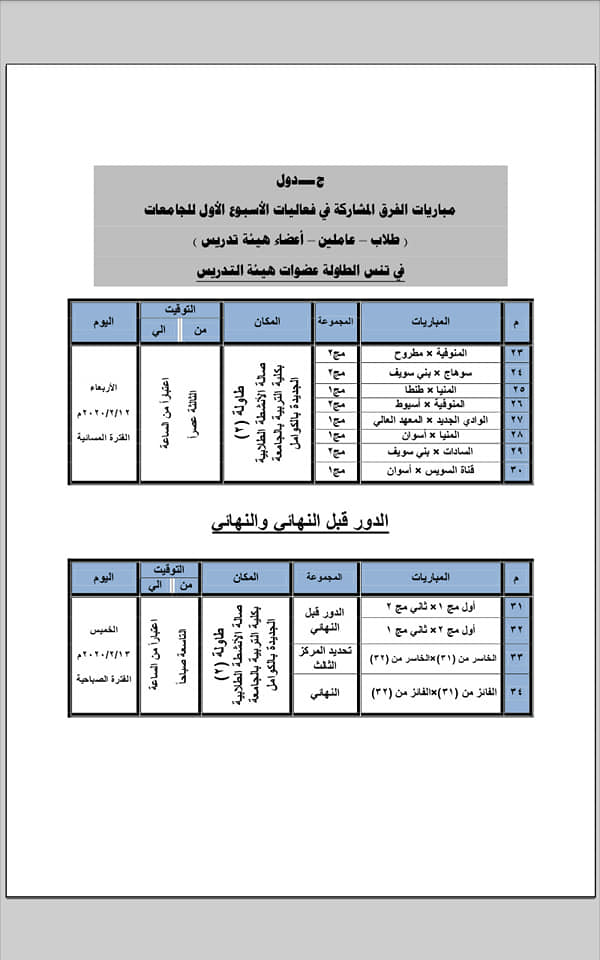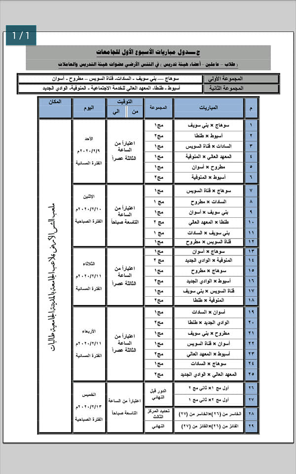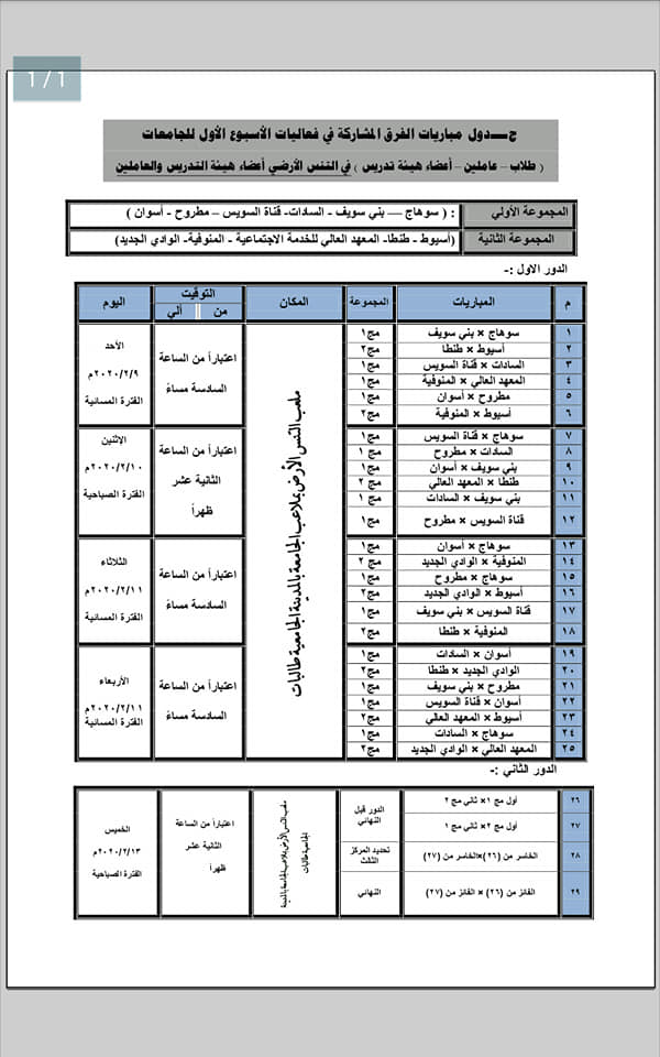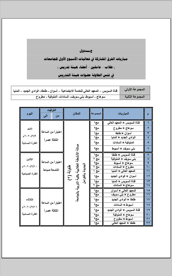 اعلنت اللجنة المنظمة لفاعليات الاسبوع الأول للجامعات المصرية والذي يقام في رحاب جامعة سوهاج في الفترة من 8 الي 14 فبراير 2020 عن مجموعات الالعاب الرياضية المختلفة، وجداول المباريات وأماكن وتوقيت اقامتها، وكذلك مواعيد الادوار النهائية الخاصة بها .