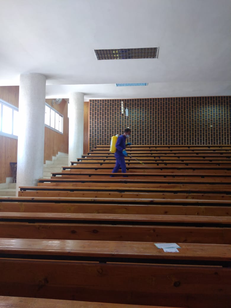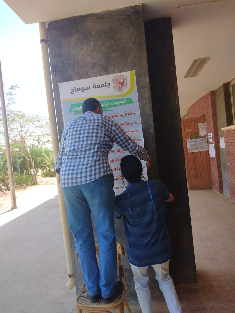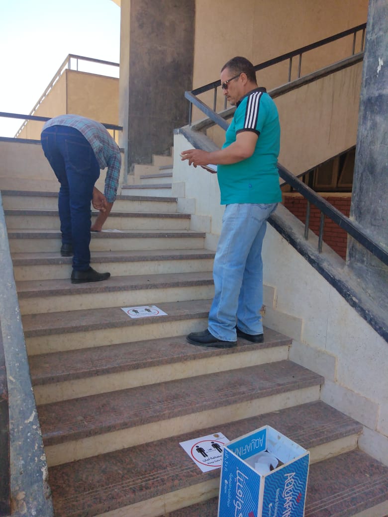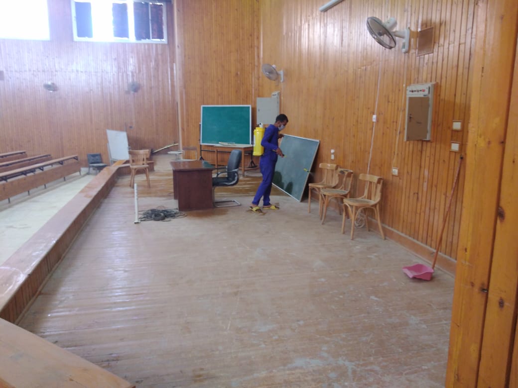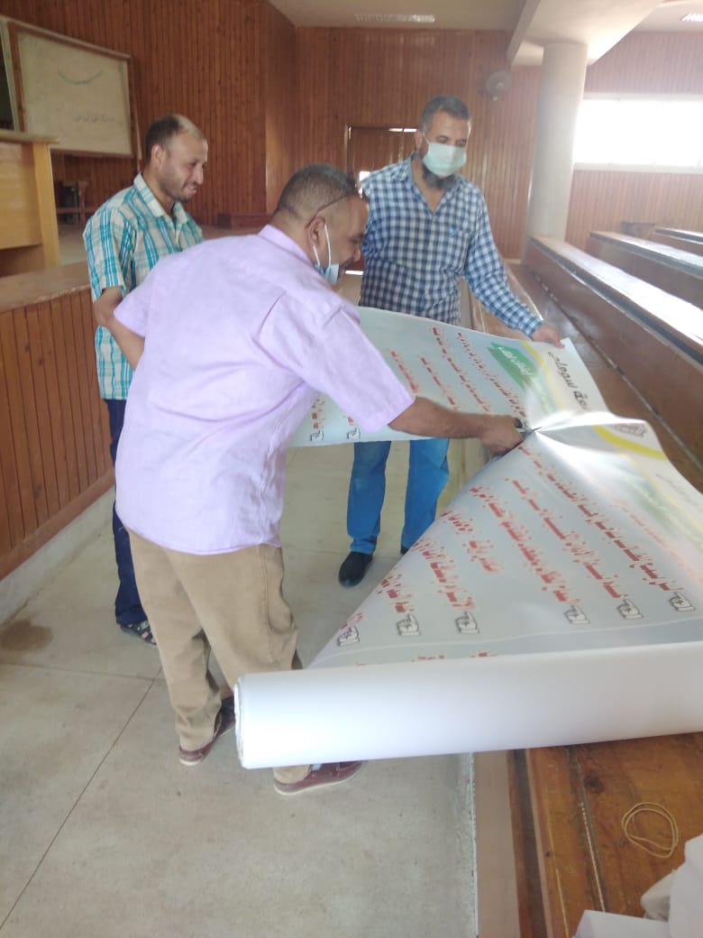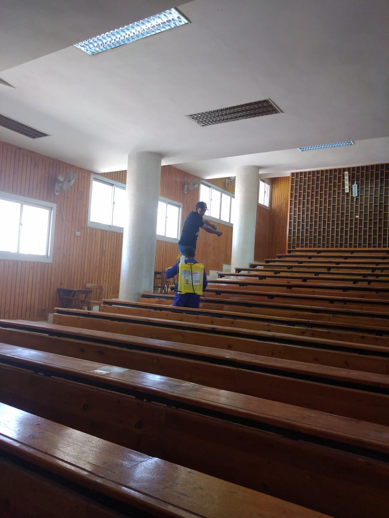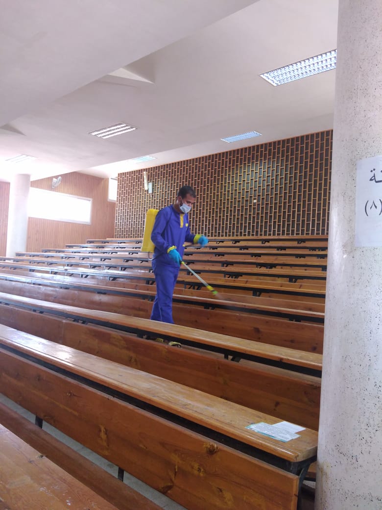 تعقيم كافة المقار المُخصَصة لامتحانات الفرقة الرابعة من مدرجات وقاعات, ووضع إرشادات وعلامات التباعد , والذى يأتي في إطار الخطة الاحترازية والوقائية لمواجهة فيروس كورونا المستجد .