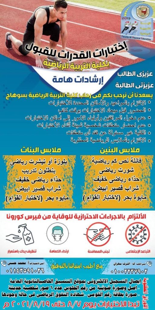 فتح باب التقدم لإختبارات القُدرات للقبول بكلية التربية الرياضية للعام الجامعى الجديد 2021-2022م بدءا من 7أغسطس وحتى 19 أغسطس 2021م