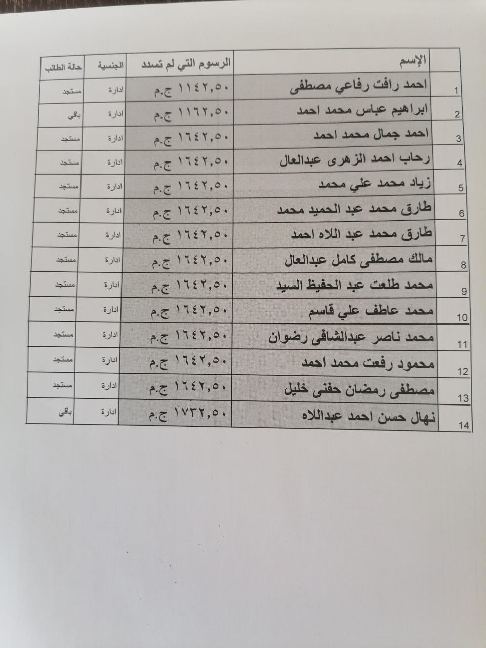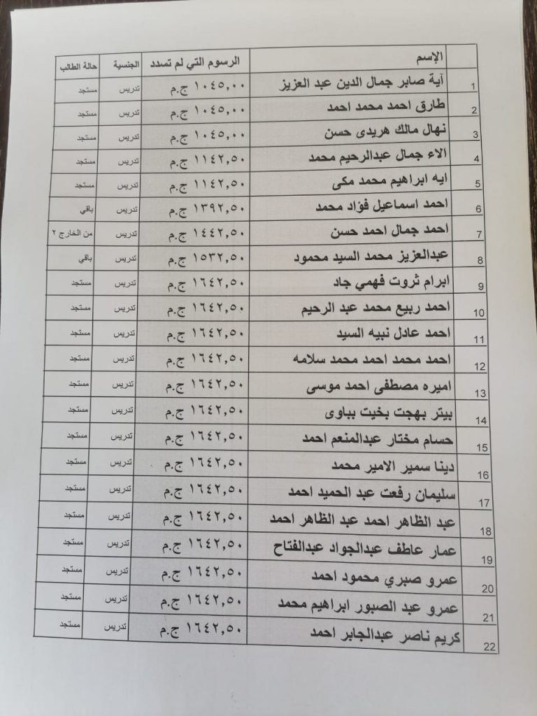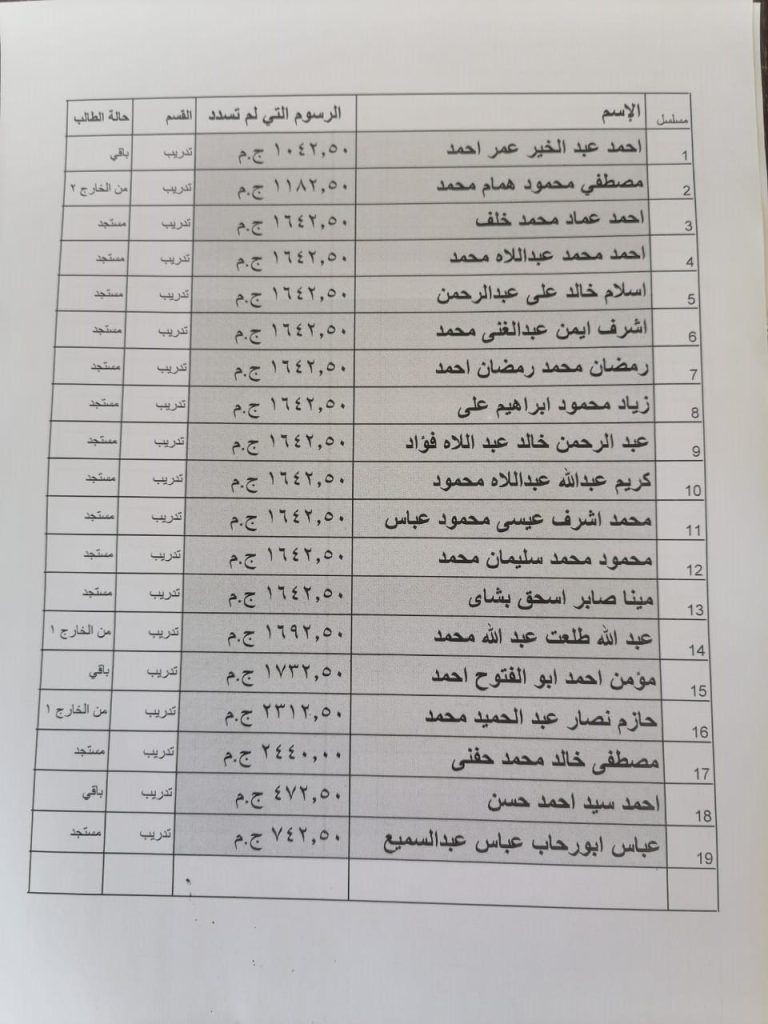 على طلاب الفرقة الثالثة (جميع التخصصات) بالعام الجامعى 2021-2022م والاتى أسمائهم سرعة سداد الرسوم الدراسية قبل بدء المعسكر الدراسى للعام الدراسى الحالى تجنبا لحجب النتيجة وإعتبار الامر هام وعاجل , علما بأن اخر موعد لسداد الرسوم بخزينة الكلية هو غدا الإثنين الموافق 20-6-2022م .