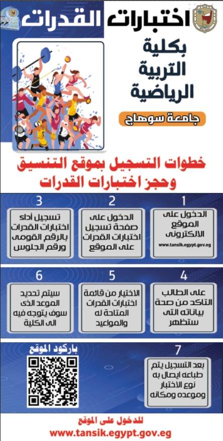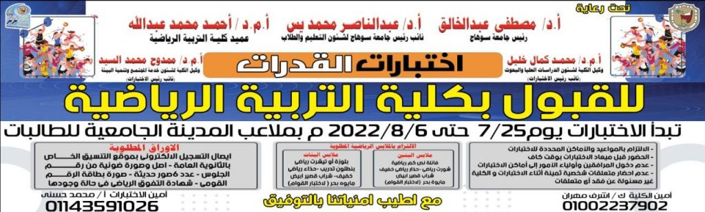 بداية من يوم غد .. فتح باب التقدم لإختبارات القدرات للقبول بكلية التربية الرياضية خلال الفترة من 25-يوليو وحتى 6-أغسطس-2022م