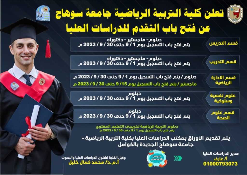 فتح باب التقدم للدراسات العُليا (دبلوم – ماجستير – دكتوراه) بأقسام كلا من التدريس – التدريب – الإدارة الرياضية – علوم نفسية وسلوكية – علوم الصحة – العام الجامعى الجديد 2023-2024م