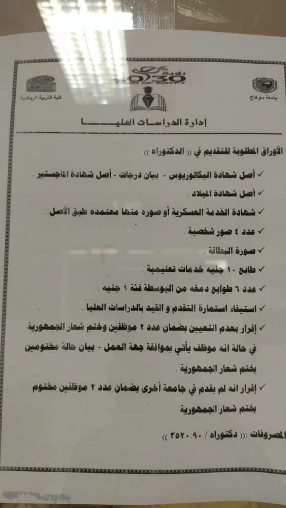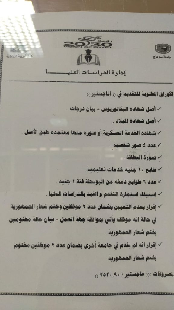 إدارة الدراسات العُليا والبحوث || الاوراق المطلوبة للتقدم للدراسات العُليا (دبلوم – ماجستير- دكتوراه) – العام الجامعى 2023-2024م