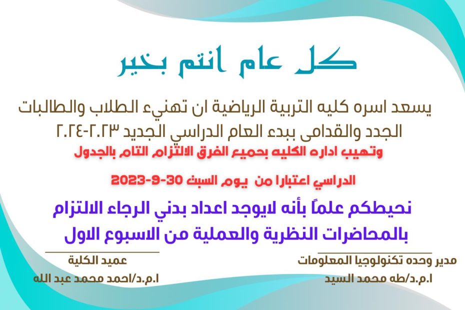 جداول المحاضرات الدراسية لجميع الفرق الدراسية – الفصل الدراسى الاول – العام الجامعى 2023-2024م