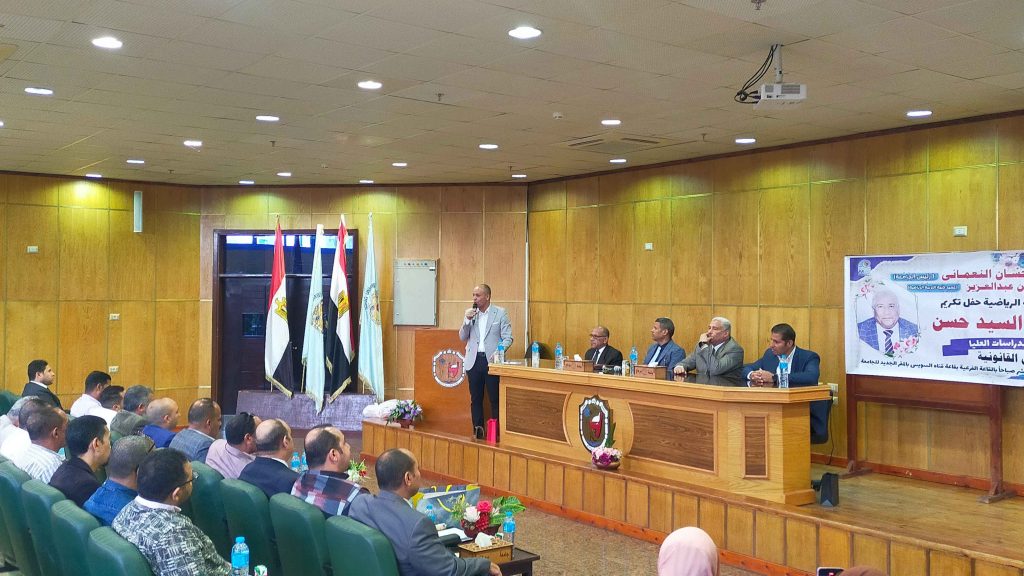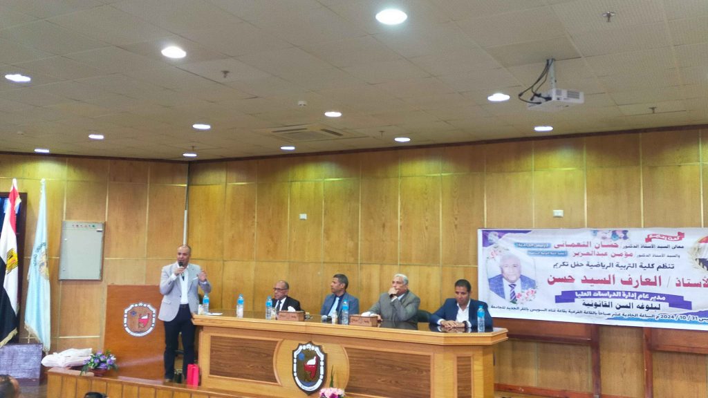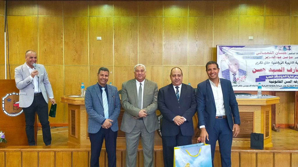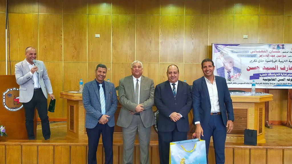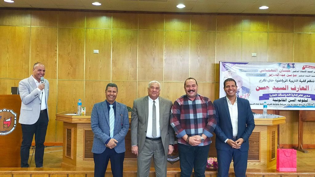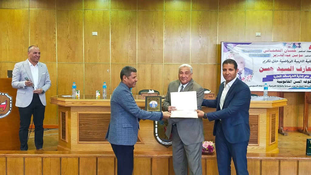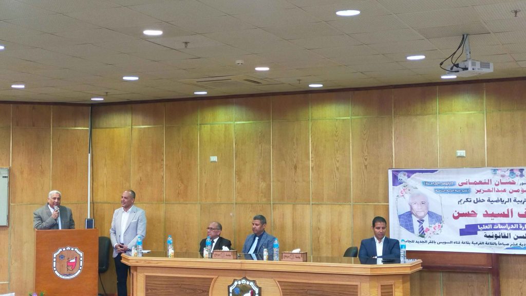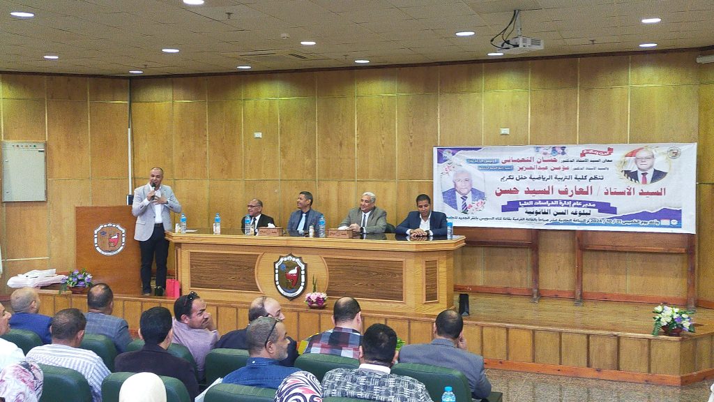 شهد صباح اليوم السيد الاستاذ الدكتور/مؤمن عبدالحميد عميد الكلية وعدد من السادة وكلاء الكلية واعضاء هيئة التدريس والجهاز الإدارى بالكلية حفل تكريم السيد الأستاذ/العارف السيد حسن مدير عام الدراسات العُليا والبحوث بالكلية ، بمناسبة بلوغه السن القانونية للتقاعد، وذلك بقاعة قناة السويس بمقر الجامعة بالكوامل وبحضور كلاً من السيد أ.د/شعبان حلمى حافظ وكيل الكلية لشئون التعليم والطلاب والسيد أ.د/محمد كمال خليل وكيل الكلية لشئون الدراسات العُليا والبحوث والسيد ا.د/ممدوح محمد السيد وكيل الكلية لشئون خدمة المجتمع وتنمية البيئة ، وكذلك عدد من رؤساء الأقسام بالكلية ونخبة من أعضاء هيئة التدريس والعاملين بالجهاز الإدارى بكلية التربية الرياضية .