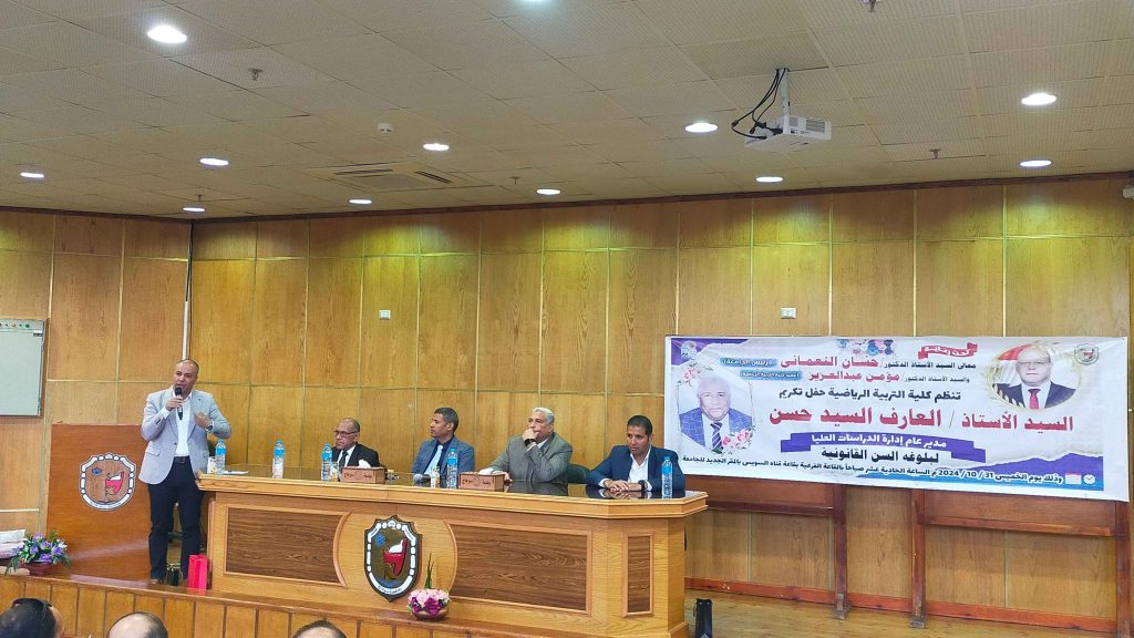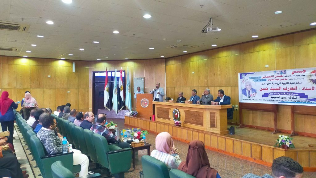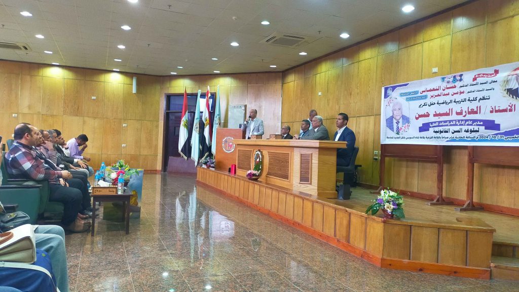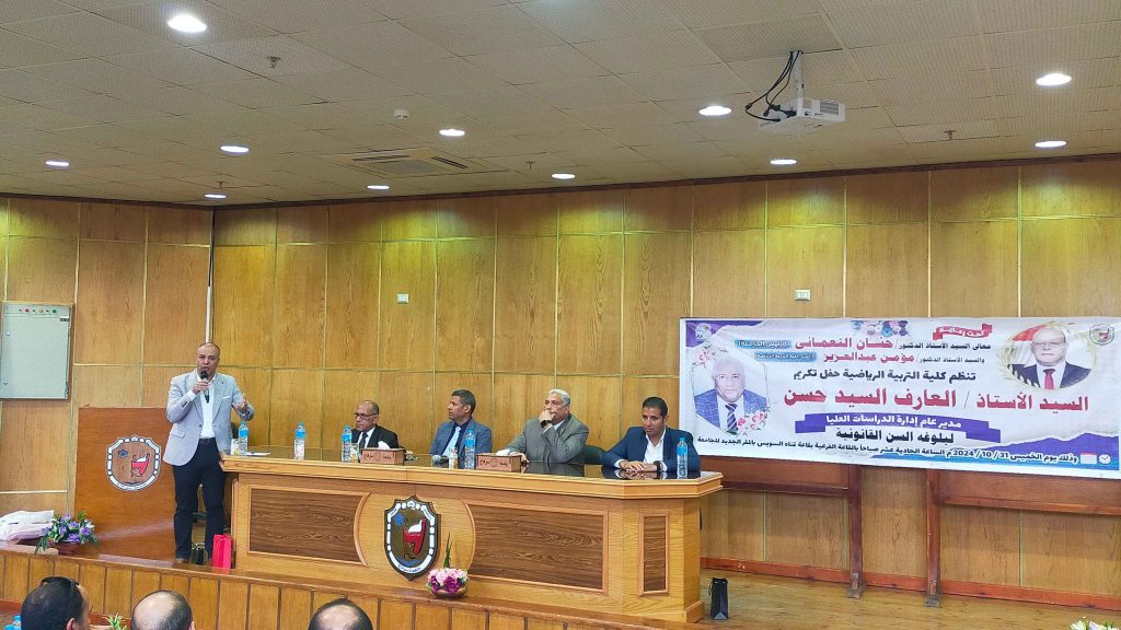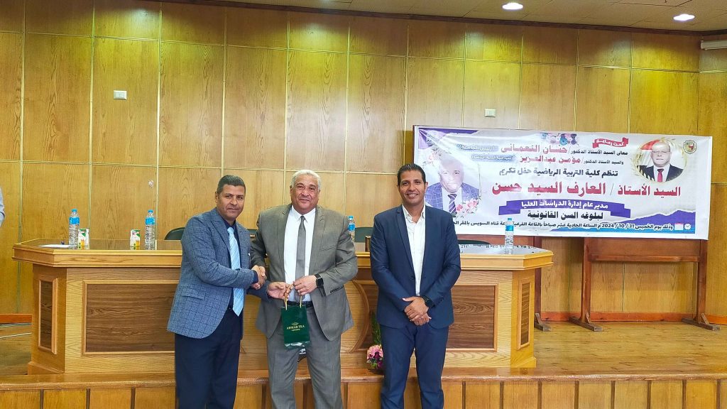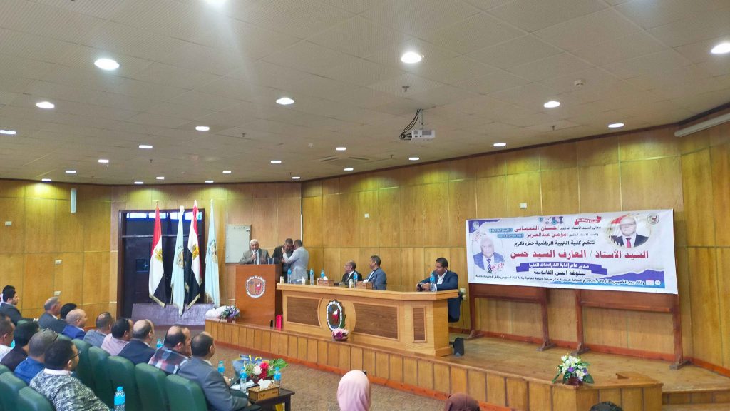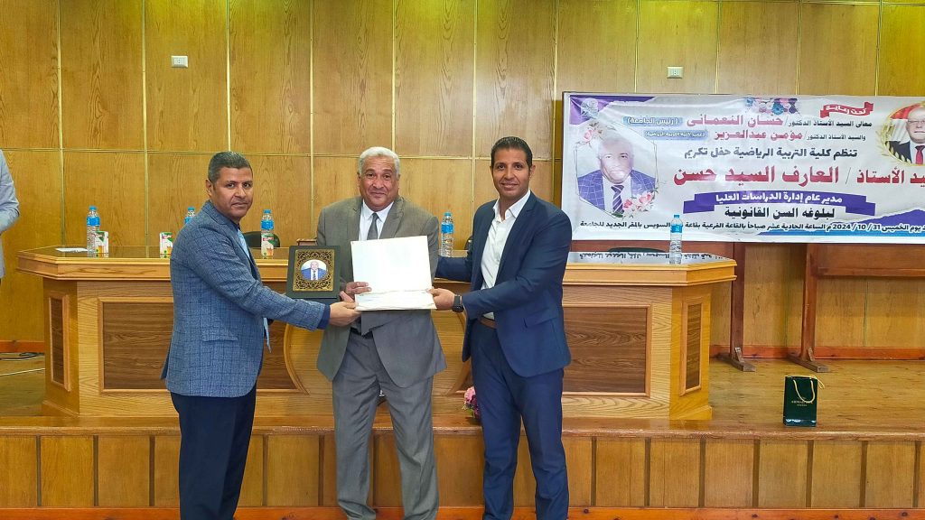 شهد صباح اليوم السيد الاستاذ الدكتور/مؤمن عبدالحميد عميد الكلية وعدد من السادة وكلاء الكلية واعضاء هيئة التدريس والجهاز الإدارى بالكلية حفل تكريم السيد الأستاذ/العارف السيد حسن مدير عام الدراسات العُليا والبحوث بالكلية ، بمناسبة بلوغه السن القانونية للتقاعد، وذلك بقاعة قناة السويس بمقر الجامعة بالكوامل وبحضور كلاً من السيد أ.د/شعبان حلمى حافظ وكيل الكلية لشئون التعليم والطلاب والسيد أ.د/محمد كمال خليل وكيل الكلية لشئون الدراسات العُليا والبحوث والسيد ا.د/ممدوح محمد السيد وكيل الكلية لشئون خدمة المجتمع وتنمية البيئة ، وكذلك عدد من رؤساء الأقسام بالكلية ونخبة من أعضاء هيئة التدريس والعاملين بالجهاز الإدارى بكلية التربية الرياضية .