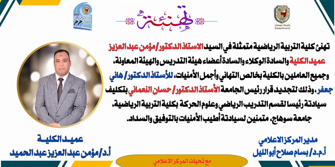 تهنئ كلية التربية الرياضية متمثلة في السيد الاستاذ الدكتور/مؤمن عبد العزيز عميد الكلية والسادة الوكلاء والسادة أعضاء هيئة التدريس والهيئة المعاونة، وجميع العاملين بالكلية بخالص التهاني وأجمل الأمنيات، للأستاذ الدكتور/ هاني جعفر ، وذلك لتجديد قرار رئيس الجامعة الأستاذ الدكتور/ حسان النعماني بتكليف سيادتة رئيسا لقسم التدريب الرياضي وعلوم الحركة بكلية التربية الرياضية، جامعة سوهاج، متمنين لسيادتة أطيب الأمنيات بالتوفيق والسداد.