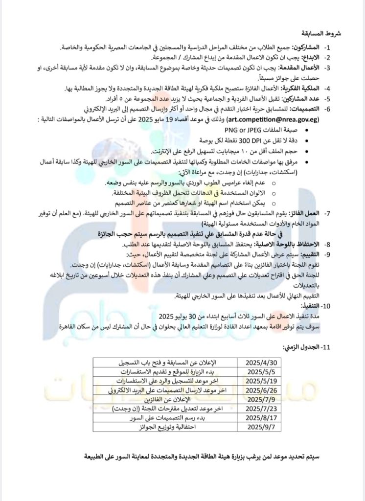 فتح باب التقدم لمسابقة “إبداع مستدام” فى مجال اللوحات التعبيرية (الجداريات) برعاية هيئة الطاقة الجديدة والمتجددة وبالتعاون مع المجلس الأعلى للجامعات