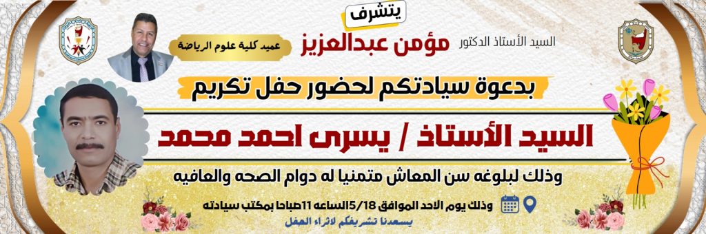 في وسط أجواء يسودها روح الود والأمتنان أقامت كلية علوم الرياضة برئاسة السيد أ.د/عميد الكلية وعدد من السادة أعضاء هيئة التدريس والعاملين بالكلية حفل تكريم للسيد الأستاذ / يسرى أحمد محمد – بإدارة الشئون العامة بالكلية , وذلك تقديراً وعرفانا بمجهوداته المحلصة وتفانيه أثناء عمله خلال فترة إمتدت لأكثر من 36 سنة خدمية بجامعة سوهاج وكلية علوم الرياضة .