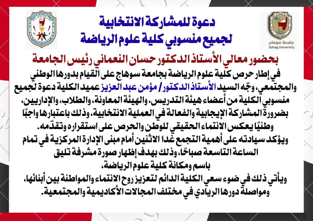 الرئيسية » دعوة للمشاركة الانتخابيةدعوة للمشاركة الانتخابيةبواسطة البوابة الإلكترونية -كلية علوم الرياضة - جامعة سوهاج وحدة تكنولوجيا المعلومات - كلية علوم الرياضة - جامعة سوهاج