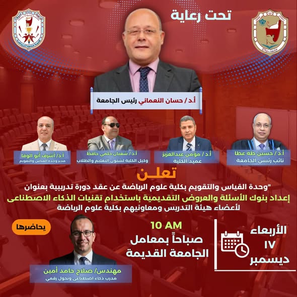 وحدة القياس والتقويم والامتحانات بكلية علوم الرياضة تنظم دورة تدريبية عن إعداد بنوك الأسئلة والعروض التقديمية باستخدام تقنيات الذكاء الاصطناعى