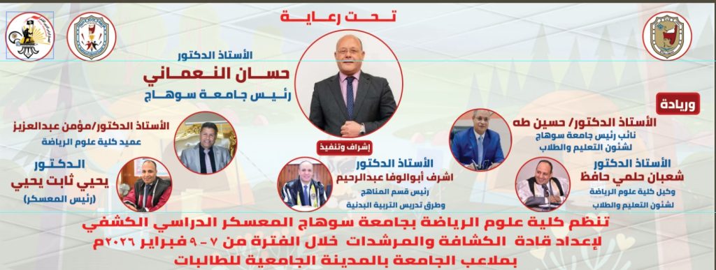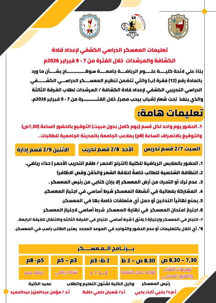 تنظم كلية علوم الرياضة جامعة سوهاج المعسكر الدراسي التدريبي الكشفي لاعداد قادة الكشافة والمرشدات لطلاب الفرقة الثالثة خلال الفترة من ٧ الي ٩ فبراير ٢٠٢٦م بملاعب الجامعة بالمدينة الجامعية للطالبات