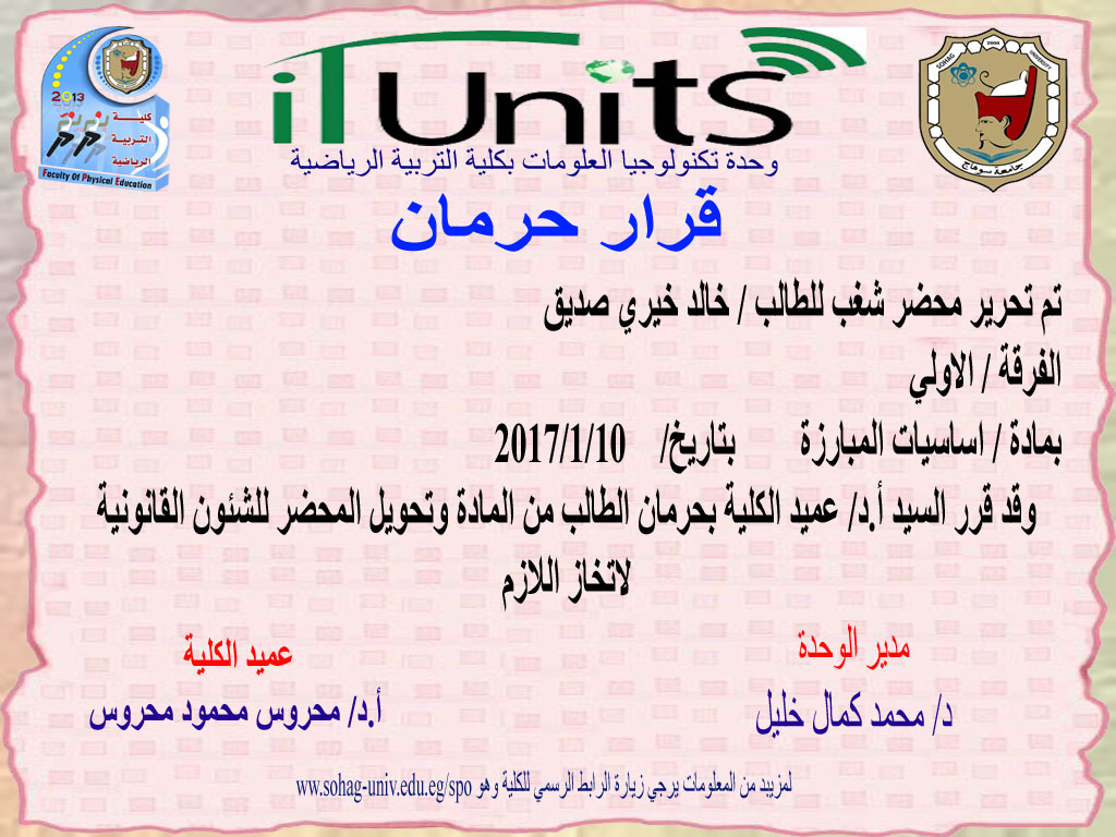 الرئيسية » قرار تاديبقرار تاديببواسطة البوابة الإلكترونية -كلية علوم الرياضة - جامعة سوهاج وحدة تكنولوجيا المعلومات - كلية علوم الرياضة - جامعة سوهاج