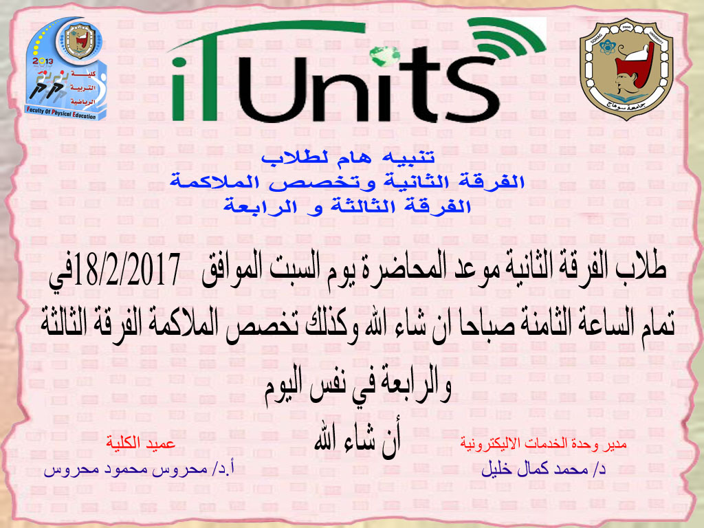 الرئيسية » تنبيه هام لطلاب الفرقة الثانية وتخصص الملاكمة الفرقة الثالثة و الرابعةتنبيه هام لطلاب الفرقة الثانية وتخصص الملاكمة الفرقة الثالثة و الرابعةبواسطة البوابة الإلكترونية -كلية علوم الرياضة - جامعة سوهاج وحدة تكنولوجيا المعلومات - كلية علوم الرياضة - جامعة سوهاج