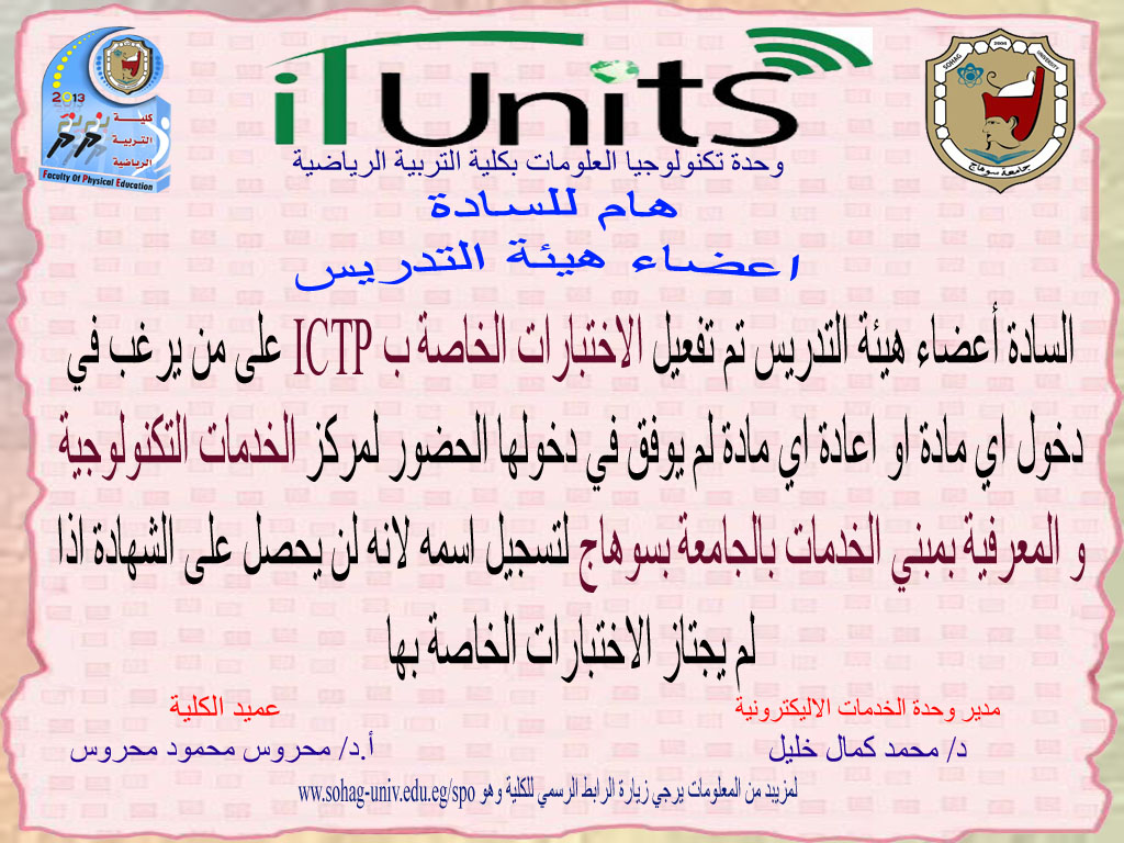 الرئيسية » هام عن الاختبارات الخاصة بـ ICTPهام عن الاختبارات الخاصة بـ ICTPبواسطة البوابة الإلكترونية -كلية علوم الرياضة - جامعة سوهاج وحدة تكنولوجيا المعلومات - كلية علوم الرياضة - جامعة سوهاج