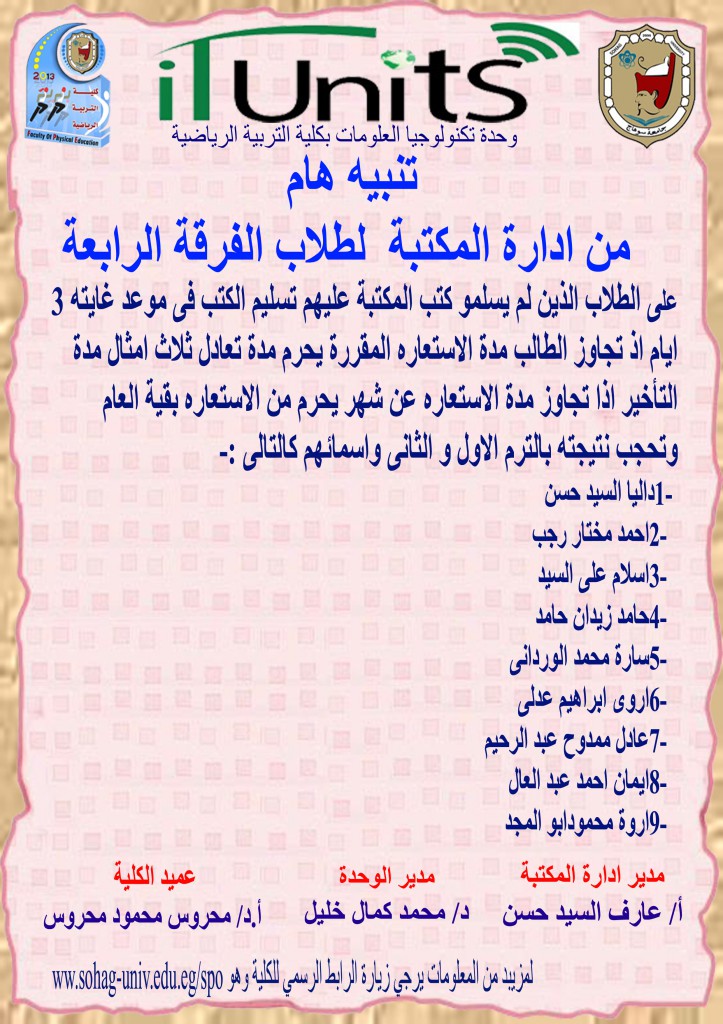 الرئيسية » تنبيه هام من ادارة المكتبة لطلاب الفرقة الرابعةتنبيه هام من ادارة المكتبة لطلاب الفرقة الرابعةبواسطة البوابة الإلكترونية -كلية علوم الرياضة - جامعة سوهاج وحدة تكنولوجيا المعلومات - كلية علوم الرياضة - جامعة سوهاج