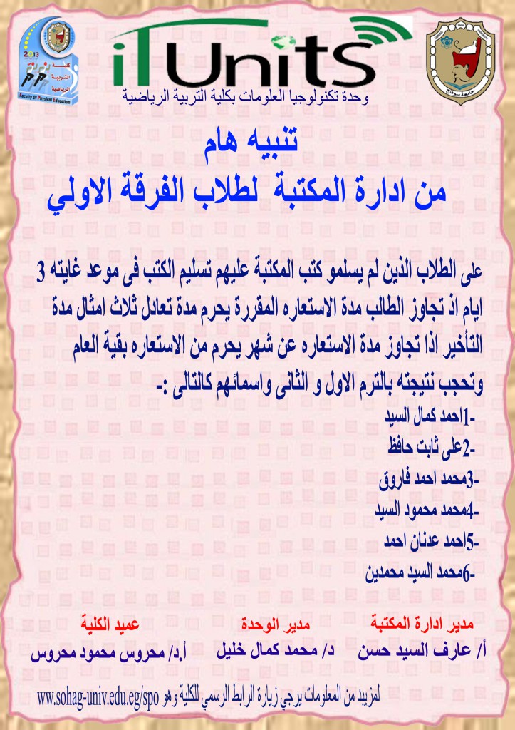 الرئيسية » تنبيه هام لطلاب الفرقة الاوليتنبيه هام لطلاب الفرقة الاوليبواسطة البوابة الإلكترونية -كلية علوم الرياضة - جامعة سوهاج وحدة تكنولوجيا المعلومات - كلية علوم الرياضة - جامعة سوهاج