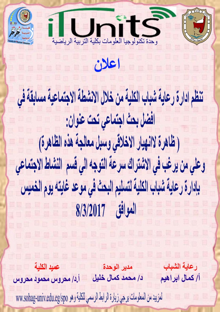 الرئيسية » اعلان عن مسابقة في البحوث الاجتماعيةاعلان عن مسابقة في البحوث الاجتماعيةبواسطة البوابة الإلكترونية -كلية علوم الرياضة - جامعة سوهاج وحدة تكنولوجيا المعلومات - كلية علوم الرياضة - جامعة سوهاج