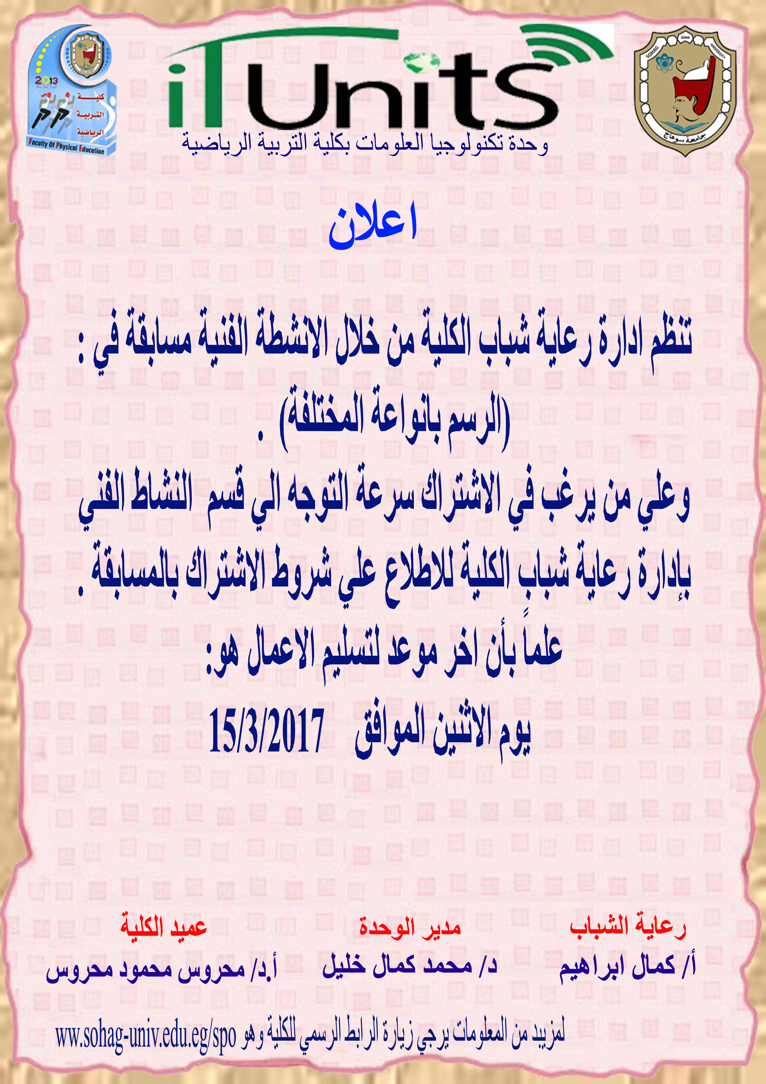 الرئيسية » اعلان : المسابقة الفنية في الرسم بانواعة المختلفةاعلان : المسابقة الفنية في الرسم بانواعة المختلفةبواسطة البوابة الإلكترونية -كلية علوم الرياضة - جامعة سوهاج وحدة تكنولوجيا المعلومات - كلية علوم الرياضة - جامعة سوهاج