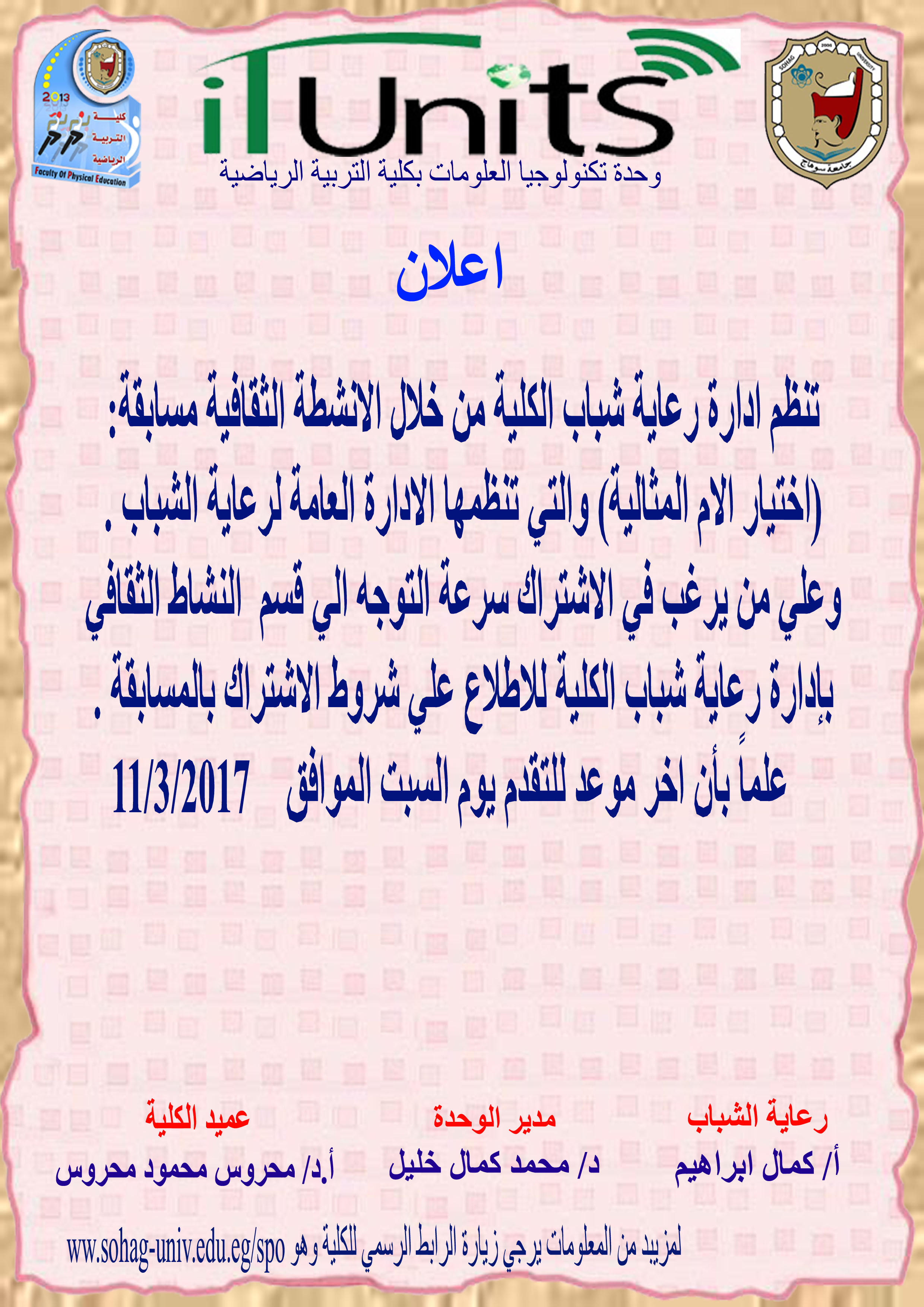 الرئيسية » اعلان : مسابقة الام المثاليةاعلان : مسابقة الام المثاليةبواسطة البوابة الإلكترونية -كلية علوم الرياضة - جامعة سوهاج وحدة تكنولوجيا المعلومات - كلية علوم الرياضة - جامعة سوهاج