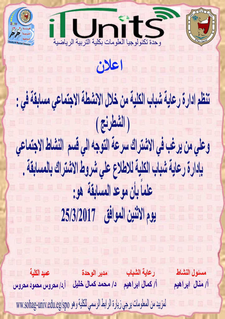 الرئيسية » مسابقة الشطرنجمسابقة الشطرنجبواسطة البوابة الإلكترونية -كلية علوم الرياضة - جامعة سوهاج وحدة تكنولوجيا المعلومات - كلية علوم الرياضة - جامعة سوهاج