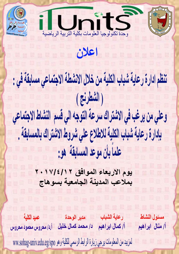 الرئيسية » موعد مسابقة الشطرنجموعد مسابقة الشطرنجبواسطة البوابة الإلكترونية -كلية علوم الرياضة - جامعة سوهاج وحدة تكنولوجيا المعلومات - كلية علوم الرياضة - جامعة سوهاج