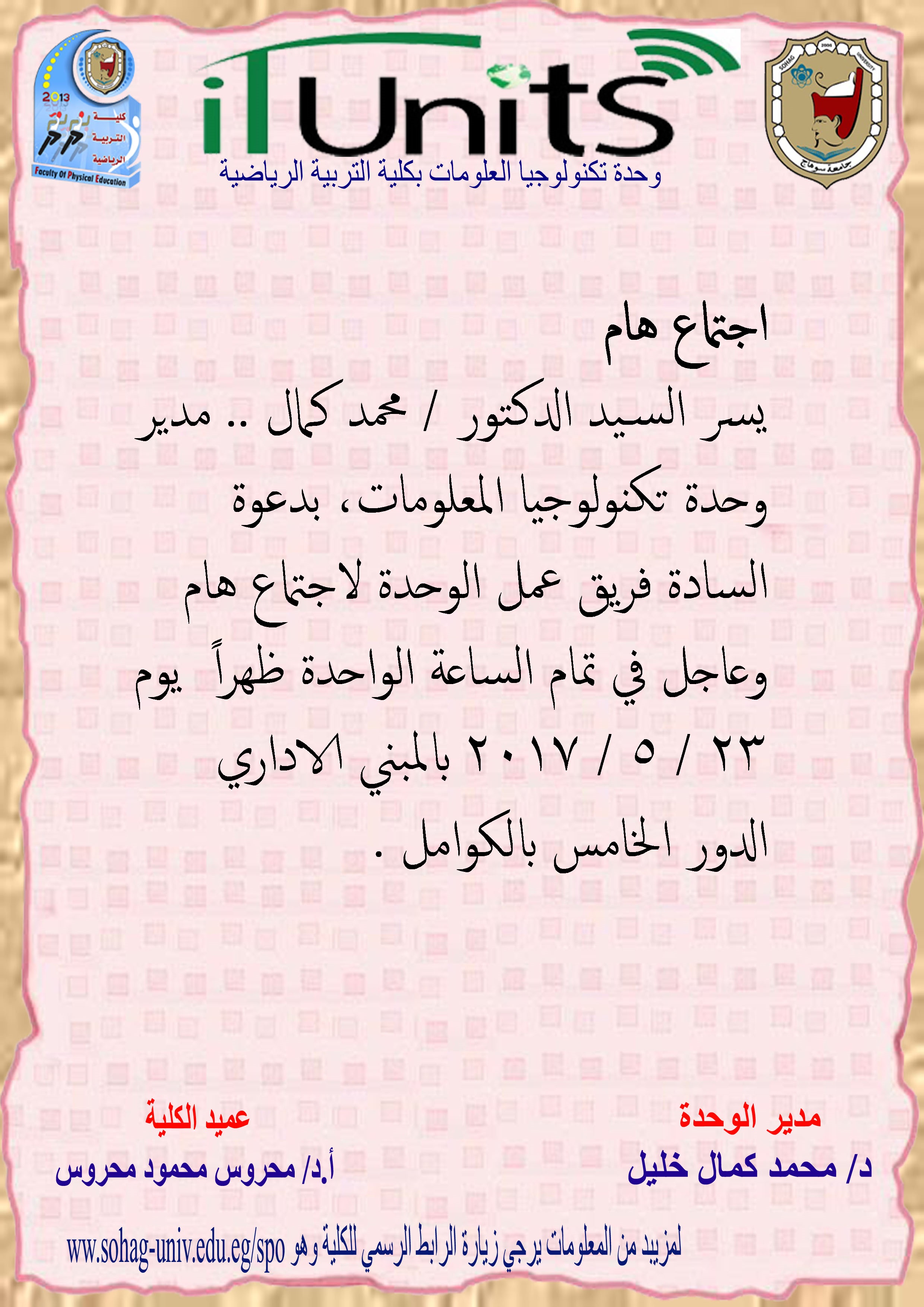 الرئيسية » دعوة اجتماع فريق عمل الوحدةدعوة اجتماع فريق عمل الوحدةبواسطة البوابة الإلكترونية -كلية علوم الرياضة - جامعة سوهاج وحدة تكنولوجيا المعلومات - كلية علوم الرياضة - جامعة سوهاج