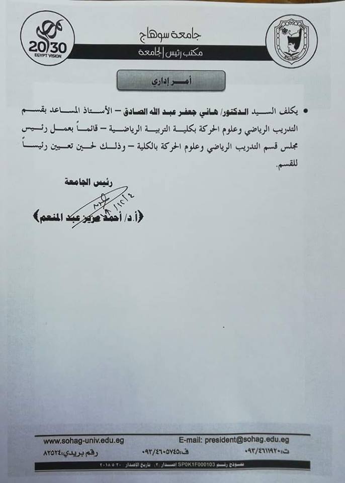 الرئيسية » تعيين السيد الدكتور/هانى جعفر قائما بعمل رئيس قسم التدريب الرياضى وعلوم الحركةتعيين السيد الدكتور/هانى جعفر قائما بعمل رئيس قسم التدريب الرياضى وعلوم الحركةبواسطة البوابة الإلكترونية -كلية علوم الرياضة - جامعة سوهاج وحدة تكنولوجيا المعلومات - كلية علوم الرياضة - جامعة سوهاج تتقدم إدارة الكلية عن السادة أعضاء هيئة التدريس والعاملين بالكلية بالتهنئة للدكتور/هانى جعفر -الأستاذ المساعد بمناسبة تعيينه قائما بعمل رئيس قسم التدريب الرياضى وعلوم الحركة بالكلية , متمنيين لسيادته دوام التقدم والتوفيق.