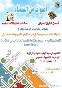 أعلن الدكتور أحمد عزيز رئيس جامعة سوهاج نتيجة مسابقة ” أصوات من السماء” لاختيار أحسن قارئ للقرآن، وأفضل إنشاد وابتهالات دينية، وهي المسابقة التي نظمتها إدارة النشاط الثقافى والفنى بالإدارة العامة لرعاية الشباب المركزية لطلاب وطالبات الجامعة من مختلف الكليات.