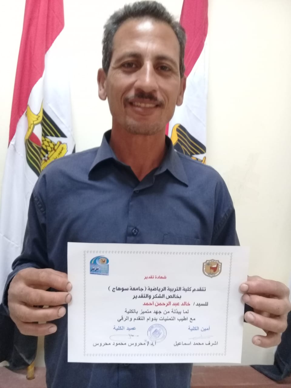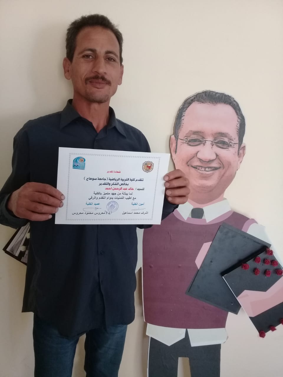 قام أ.د/محروس محمود محروس عميد الكلية والأستاذ/أشرف محمد إسماعيل أمين الكلية اليوم بتكريم عدد من العمال وأفراد الخدمات المعاونة بالكلية , وذلك بتوزيع شهادات التقدير لهم نظير جهودهم المتميزة والمضنية منذ إنشاء وتأسيس كلية التربية الرياضية , وهم :-