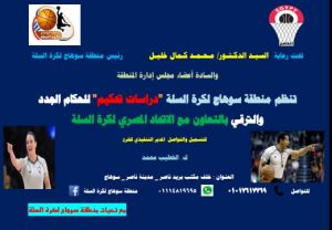 تحت رعايه السيد اﻻستاذ الدكتور مجدى ابوفريخه رئيس اﻻتحاد المصرى لكرة السله والسيد الدكتور محمد كمال رئيس المنطقه والساده اعضاء مجلس اﻻدارة واعضاء لجنه الحكام الرئيسية تعلن المنطقه عن تنظيم دورة فى تحكيم كرة السله علما بإن قيمه اﻻشتراك 200 جنيه فعلى من يرغب الحصول على الدراسات التواصل مع المدير التنفيذى للمنطقه ك الخطيب محمد