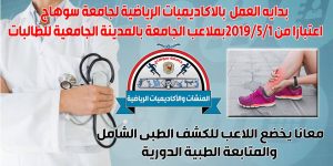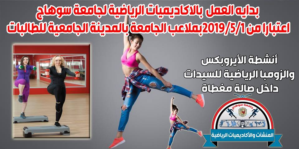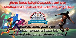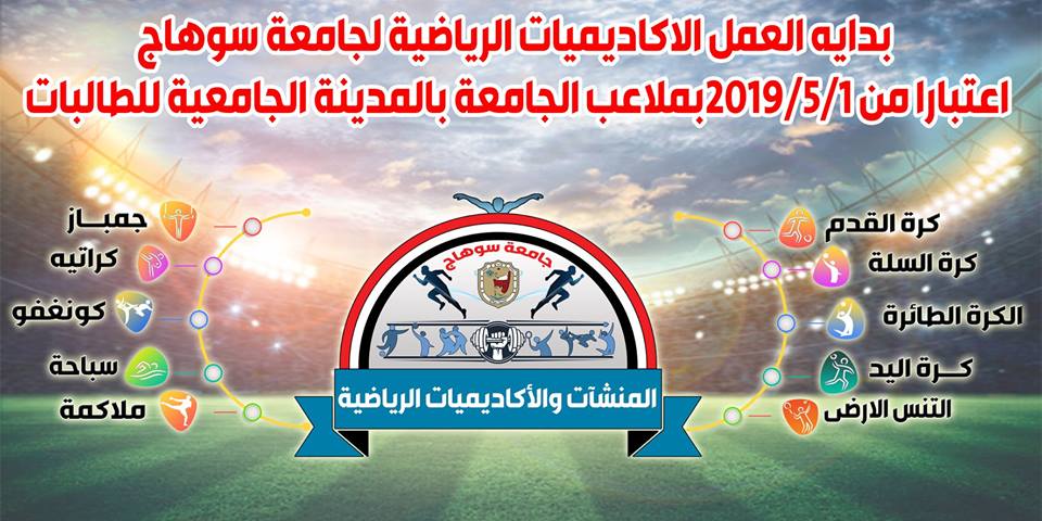 بدايه العمل الاكاديميات الرياضية لجامعة سوهاج اعتبارا من 2019/5/1بملاعب الجامعة بالمدينة الجامعية للطالبات …. للحجز والأستعلام : د/ يحي ثابت (المدير الإداى للأكاديميات) 01102040209-01008369222