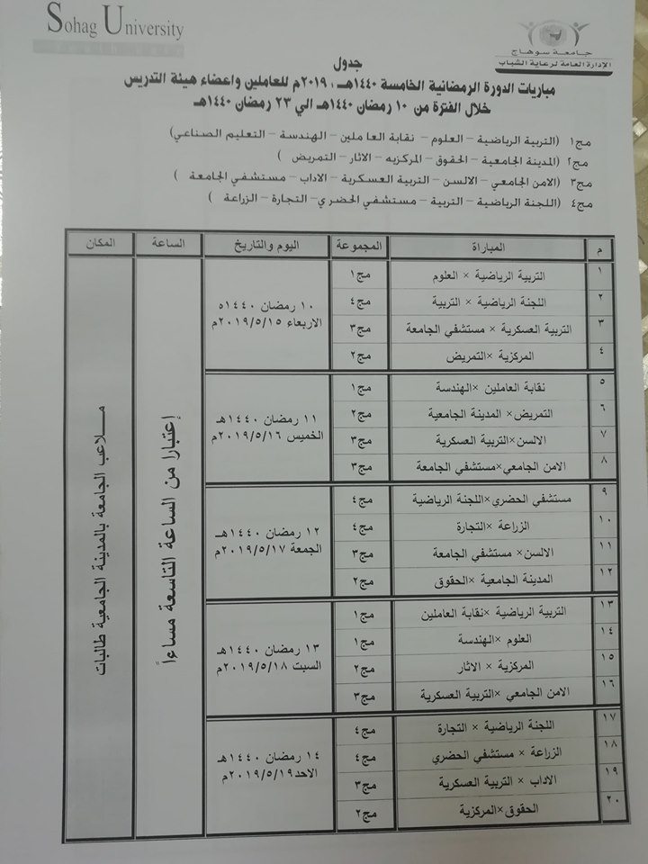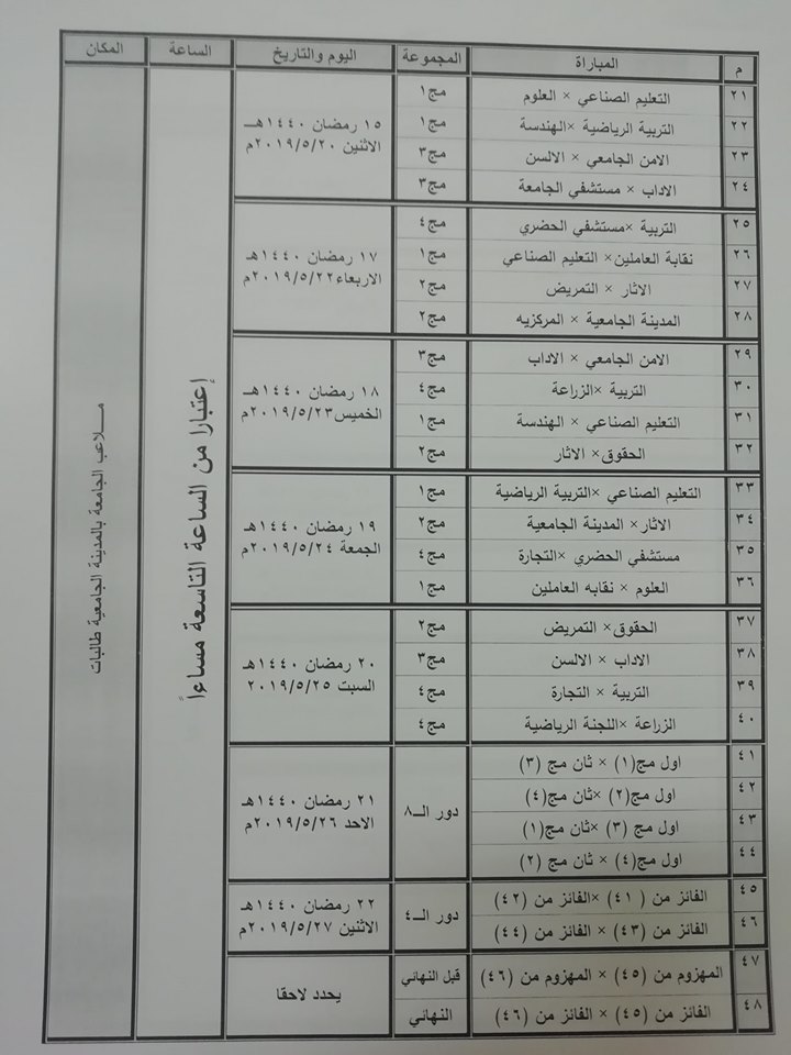 تنظم إدارة النشاط الرياضي بالإدارة العامة لرعاية الشباب مركزية مباريات الدورة الرمضانية الخامسة ١٤٤٠ هجرية / ٢٠١٩ ميلادية…..