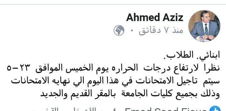 بناءاً علي قرار الاستاذ الدكتور احمد عزيز عبد المنعم رئيس الجامعة بتأجيل امتحانات يوم الخميس الموافق ٢٣/٥