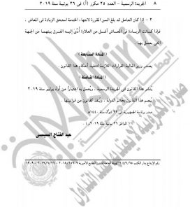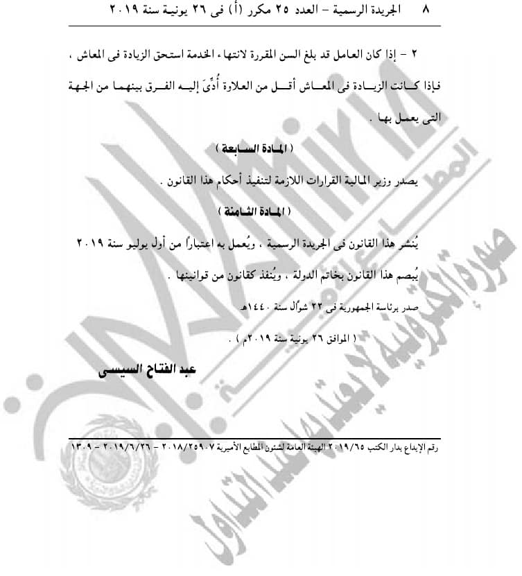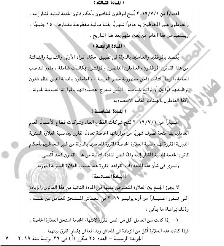 إصدار قانون بشأن العلاوة الدورية 7 في المائة للمخاطبين بقانون الخدمه المدنيه و 10 في المائة لغير المخاطبين ، بحد أدني 75 جنيه ، و 150 جنيه حافز شهريا