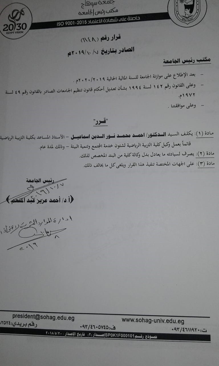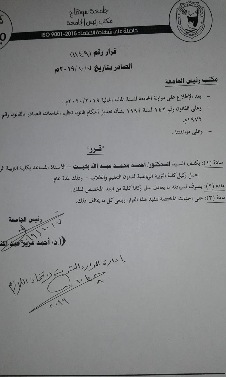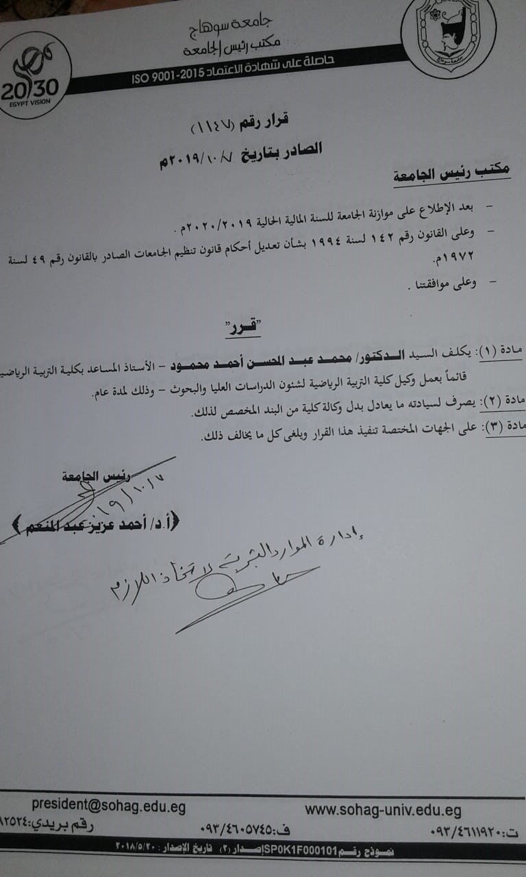 أصدر الاستاذ الدكتور احمد عزيز رئيس الجامعة قرارات بتكليف 3 قائمين بأعمال وكلاء الكلية لشئون(التعليم والطلاب – الدراسات العليا – خدمة البيئة والمجتمع) بكلية التربية الرياضية – جامعة سوهاج , حيث تم تكليف كلا من :-