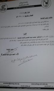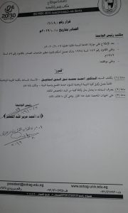 2-السيد الدكتور /احمد محمد عبدالله بخيت – الاستاذ المساعد بالكلية قائما بعمل وكيل الكلية لشئون التعليم والطلاب – لمدة عام.