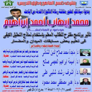 يتشرف قسم المناهج وطرق التدريس بدعوة سيادتكم لحضور مناقشة رسالة الدكتوراه الخاصة بالسيد / محمد ايهاب احمد المدرس المساعد بقسم المناهج وطرق تدريس التربية الرياضية , وذلك يوم الخميس الموافق ٢٤/ ١٠ في تمام الساعة الثانية ظهراً بكلية التربية الرياضية للبنات جامعة الإسكندرية.