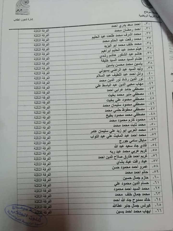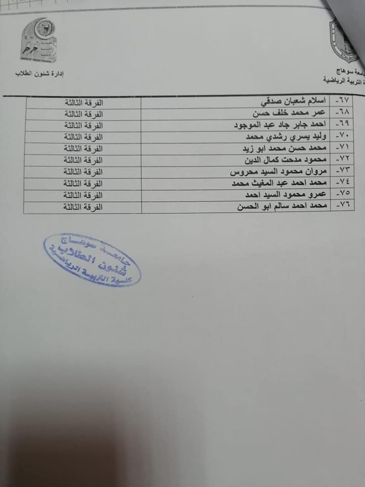 علي الطلاب الآتي آسمائهم بالكشوف سرعة احضار استمارة تأجيل التجنيد والتوجه لإدارة شئون الطلاب للأهمية القصوى تجنبا للتحقيق وإلغاء القيد بالكلية